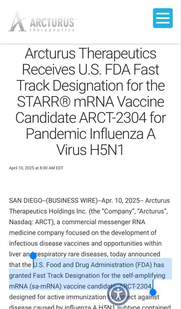 As reported by The Focal Points in their article “BREAKING: FDA Fast Tracks Self-Amplifying RNA (saRNA) Vaccines,” this technology is being pushed under the banner of pandemic preparedness and “next-generation” solutions, with little to no public discourse or regulatory transparency.