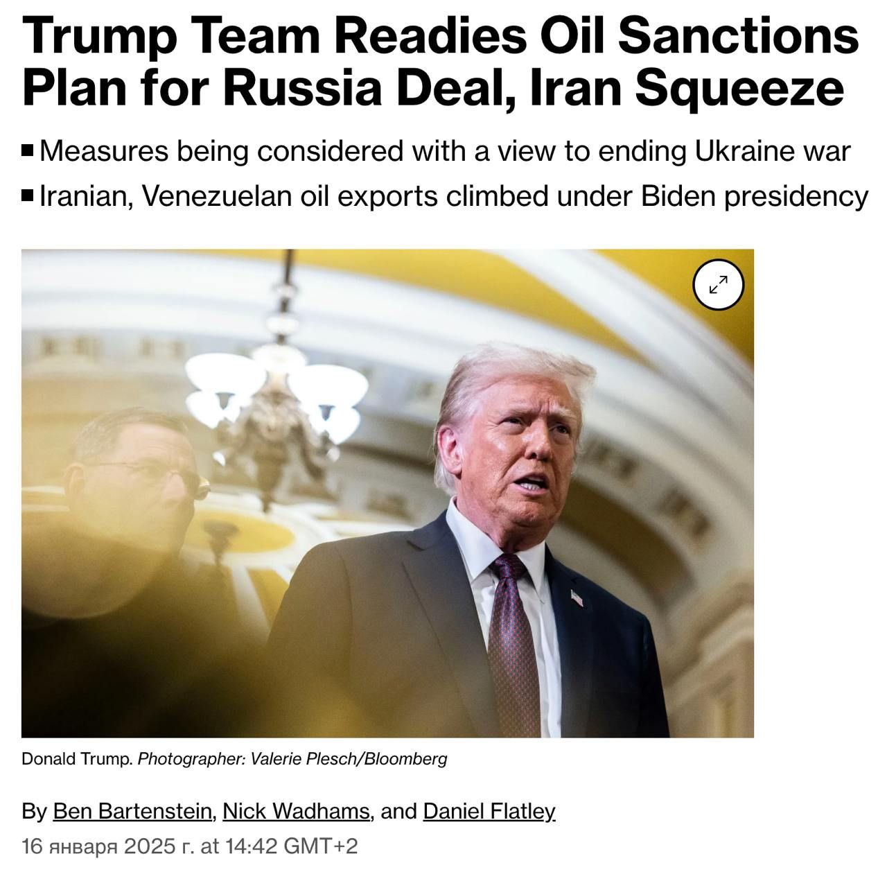 Trump’s Team is Developing a Broad Sanctions Strategy to Force a Deal Between Russia and Ukraine in the Coming Months While Putting Pressure on Iran and Venezuela, Bloomberg Reports, Citing Sources