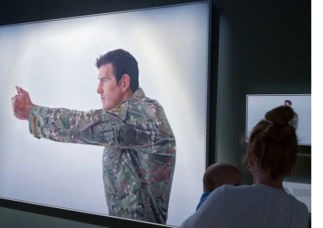 A visitor looks at a display featuring decorated war veteran Ben Roberts-Smith at the Australian War Memorial in Canberra, Australia, Friday, 2 June 2023