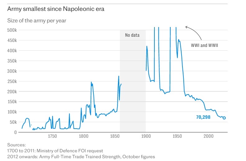 The most recent figures show a very marginal increase in the number of people joining the military. But it is still at its lowest ebb since the Napoleonic Wars.